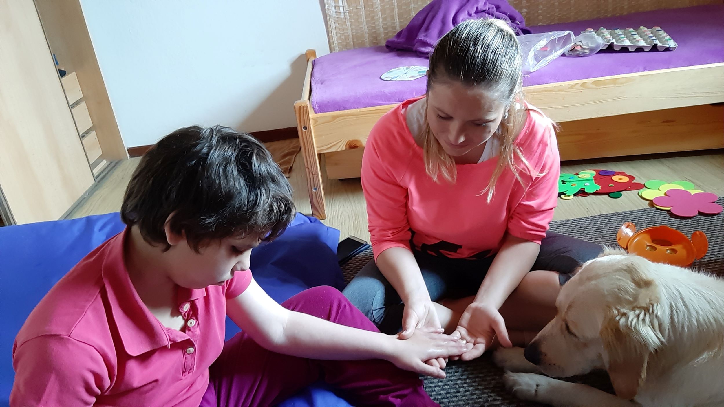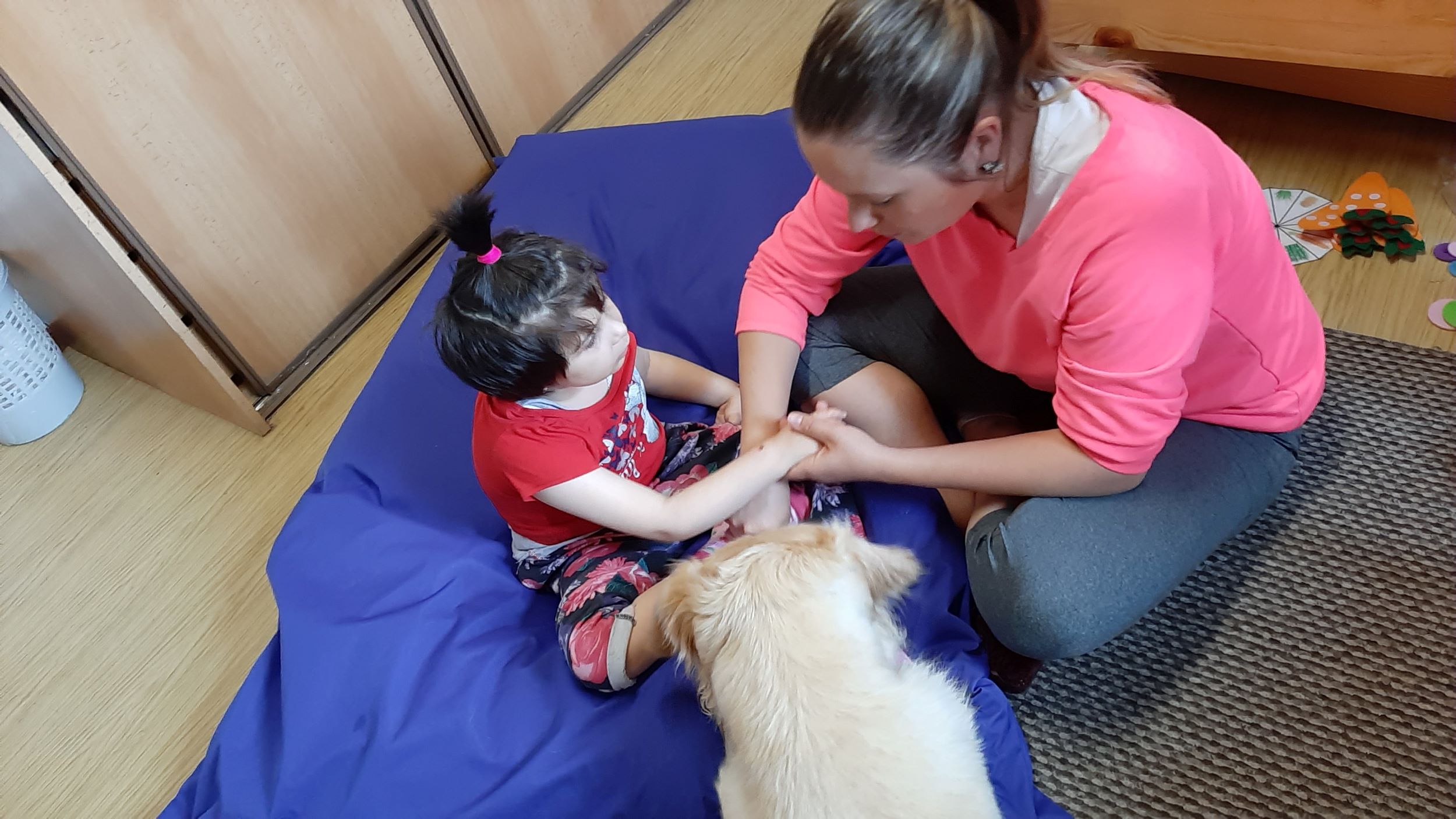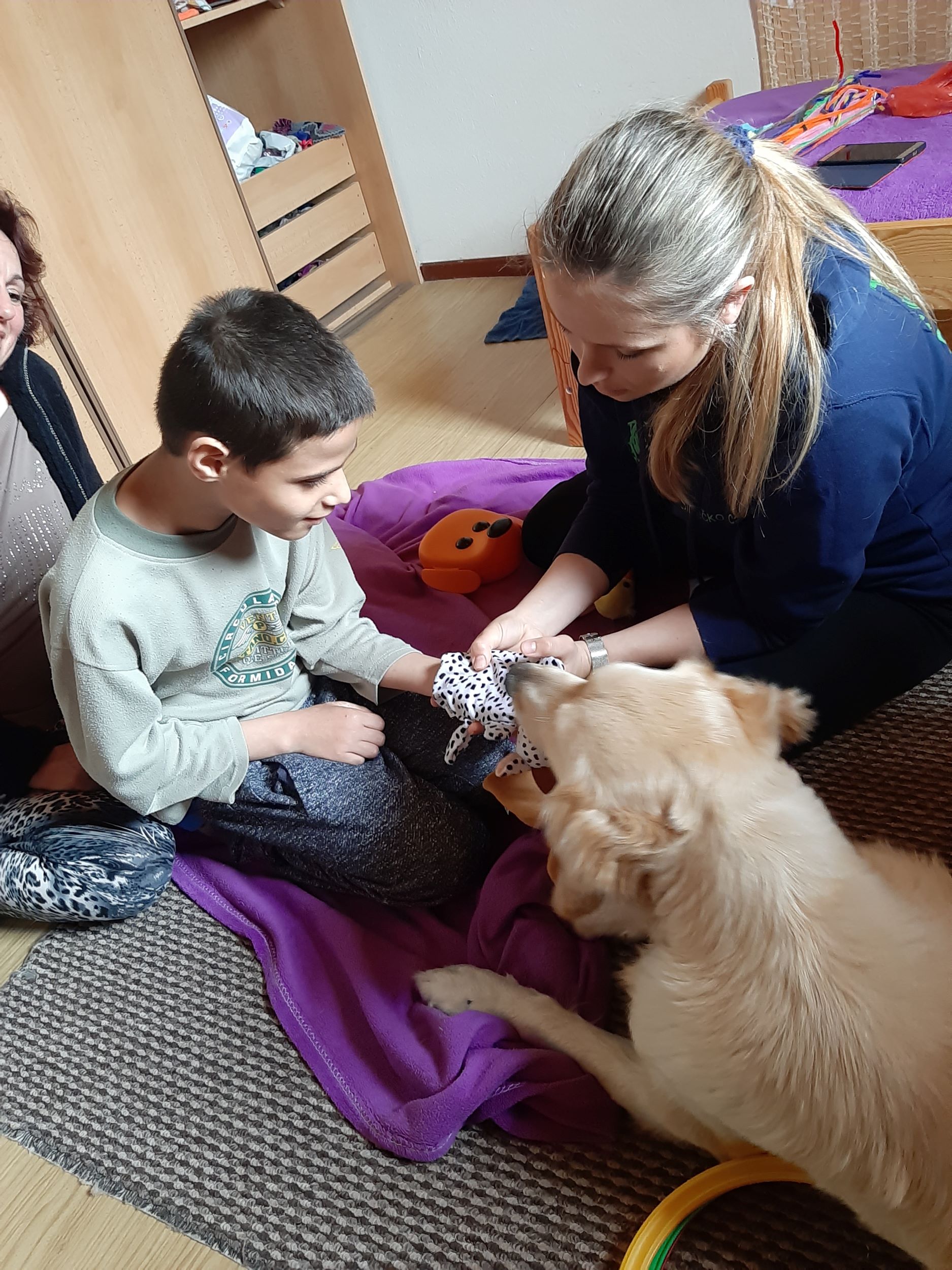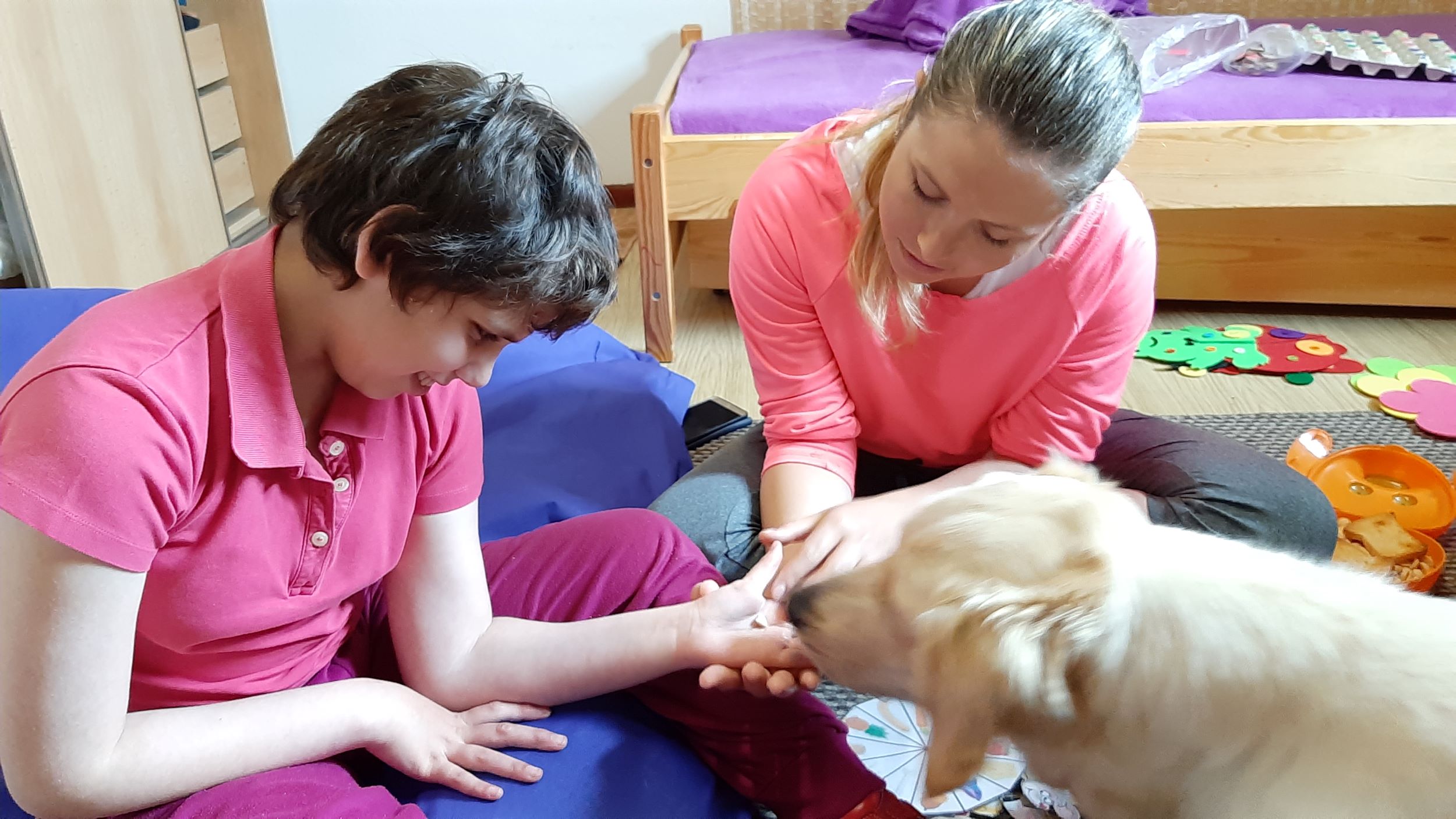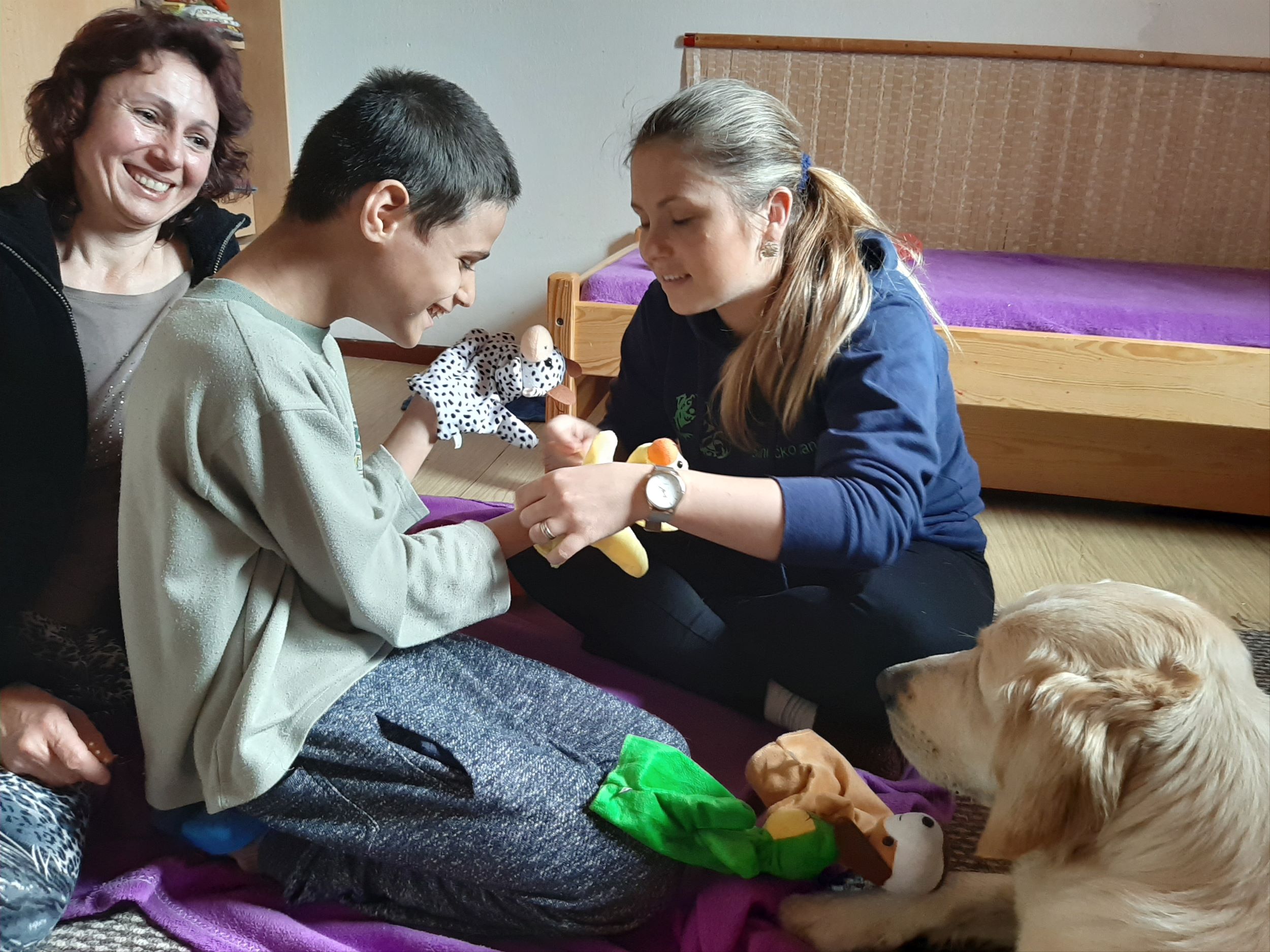 Každý druhý piatok v mesiaci nás navštevuje veľmi milá návšteva. Ide o tetu Veronika so svojim psíkom Sendy. Spolu s nimi trávime jedno krásne dopoludnie plné hier a aktivít. Sendy sa stala našou veľkou priateľkou a deti sa na ňu veľmi tešia. Hra so psíkom, polohovanie, a rôzne aktivity v spoločnosti tejto štvornohej kamarátky nám veľmi prospievajú a netrpezlivo očakávame, kedy k nám opäť zavíta. Teta Veronika je veľmi priateľská a získala si pozornosť našich všetkých ratolesti. Neustále nás zahŕňa novými činnosťami, logickými a didaktickými hrami čo deti motivuje k tvorivosti. Žiaci sa veľmi tešia, keď môžu kŕmiť Sendy. Piškótky, ktoré jej tak veľmi chutia dokážu v svojich prštekoch poprelamovať na požadovaný počet kusov a s veľkým odhodlaním jej ponúkajú svoju dlaň, aby si piškótku uchmatla. Niekedy je šikovnejšia ako my, ale nám to vôbec nevadí. Táto terapia je pre nás obrovskom výzvou a my sme sa jej zhostili na 100%.