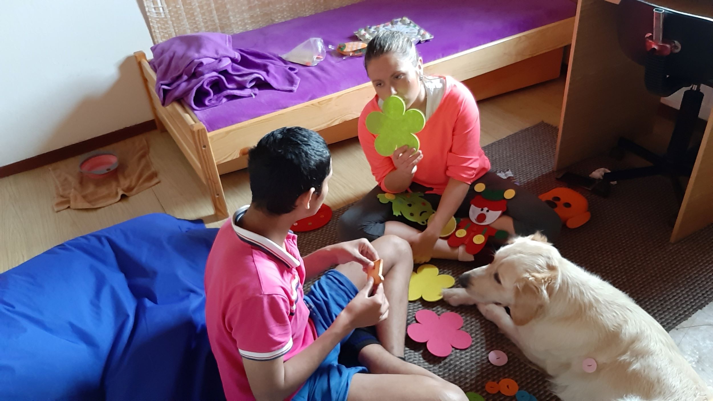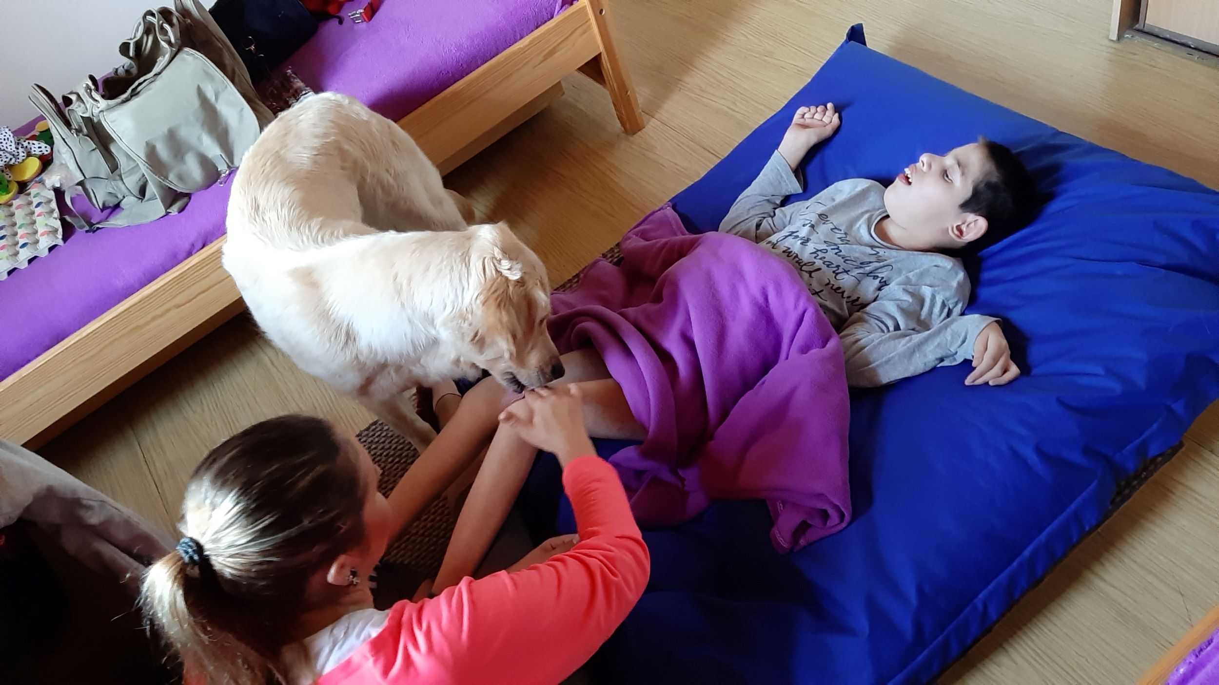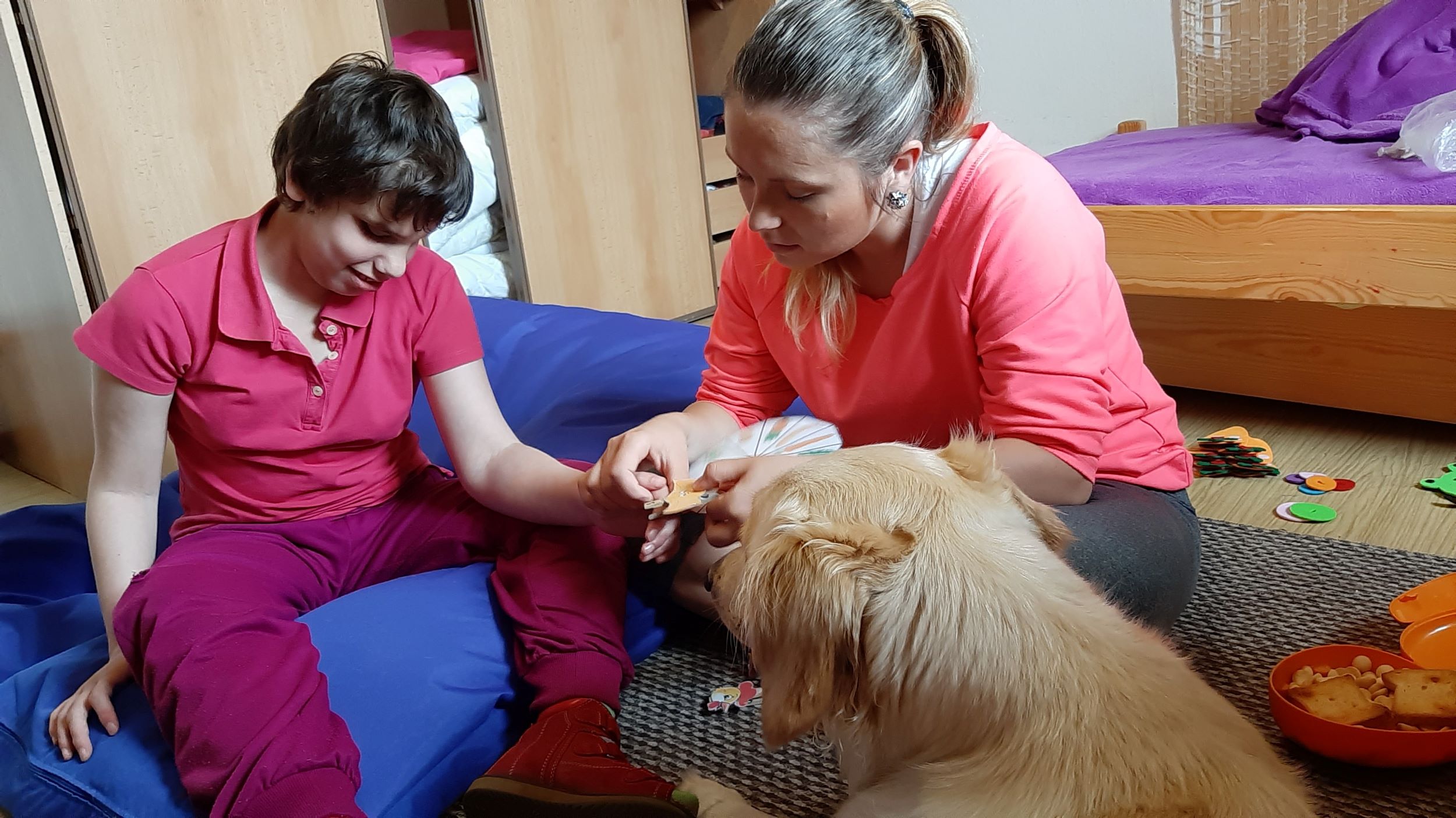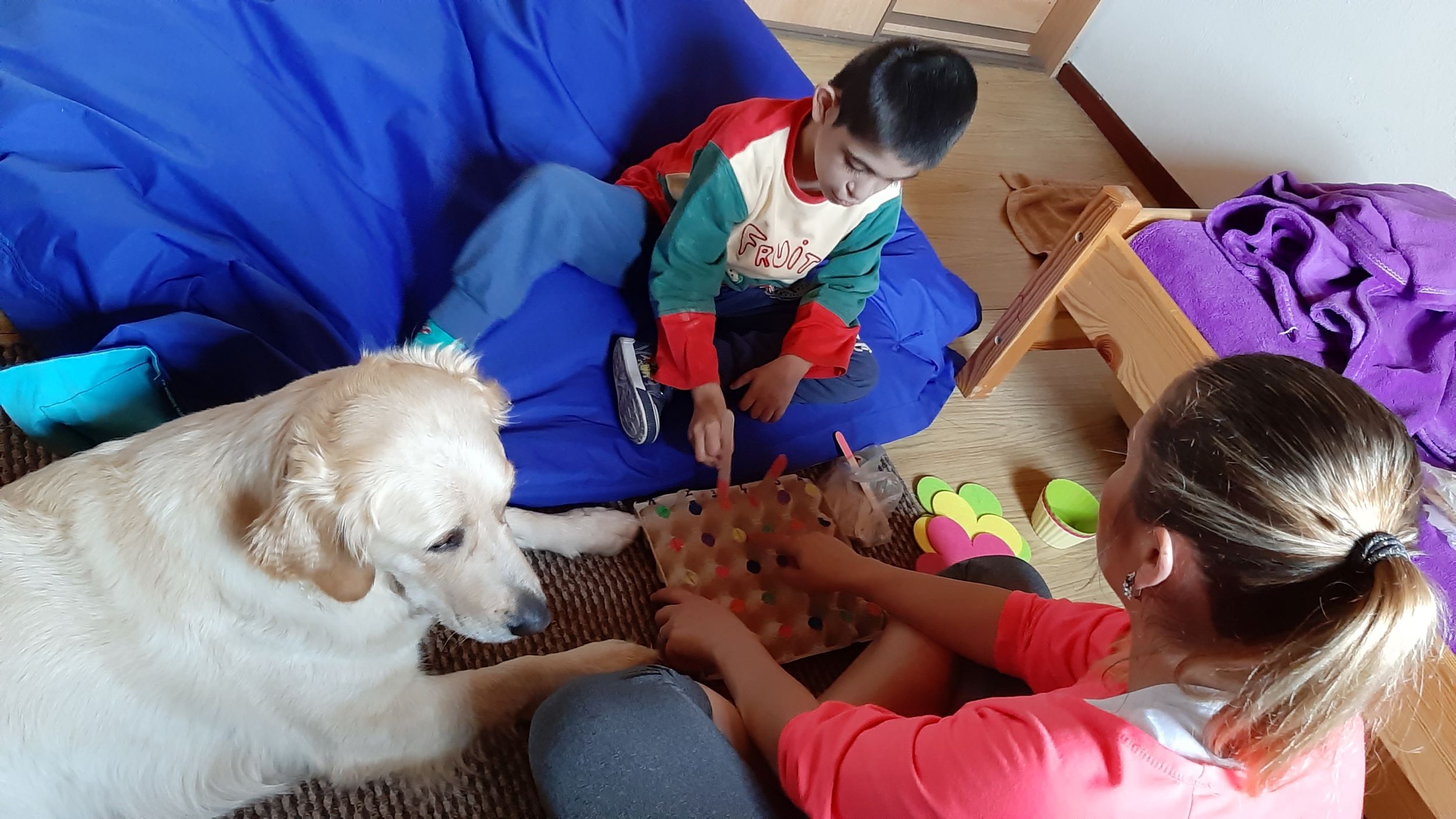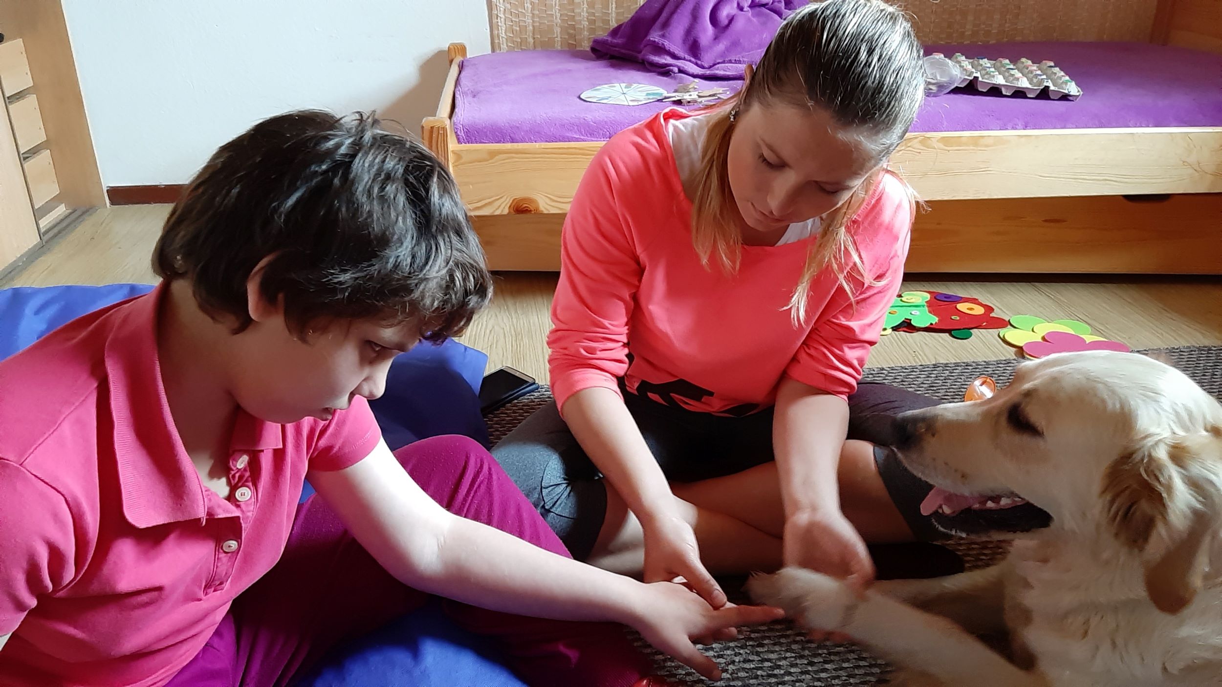 Každý druhý piatok v mesiaci nás navštevuje veľmi milá návšteva. Ide o tetu Veronika so svojim psíkom Sendy. Spolu s nimi trávime jedno krásne dopoludnie plné hier a aktivít. Sendy sa stala našou veľkou priateľkou a deti sa na ňu veľmi tešia. Hra so psíkom, polohovanie, a rôzne aktivity v spoločnosti tejto štvornohej kamarátky nám veľmi prospievajú a netrpezlivo očakávame, kedy k nám opäť zavíta. Teta Veronika je veľmi priateľská a získala si pozornosť našich všetkých ratolesti. Neustále nás zahŕňa novými činnosťami, logickými a didaktickými hrami čo deti motivuje k tvorivosti. Žiaci sa veľmi tešia, keď môžu kŕmiť Sendy. Piškótky, ktoré jej tak veľmi chutia dokážu v svojich prštekoch poprelamovať na požadovaný počet kusov a s veľkým odhodlaním jej ponúkajú svoju dlaň, aby si piškótku uchmatla. Niekedy je šikovnejšia ako my, ale nám to vôbec nevadí. Táto terapia je pre nás obrovskom výzvou a my sme sa jej zhostili na 100%.