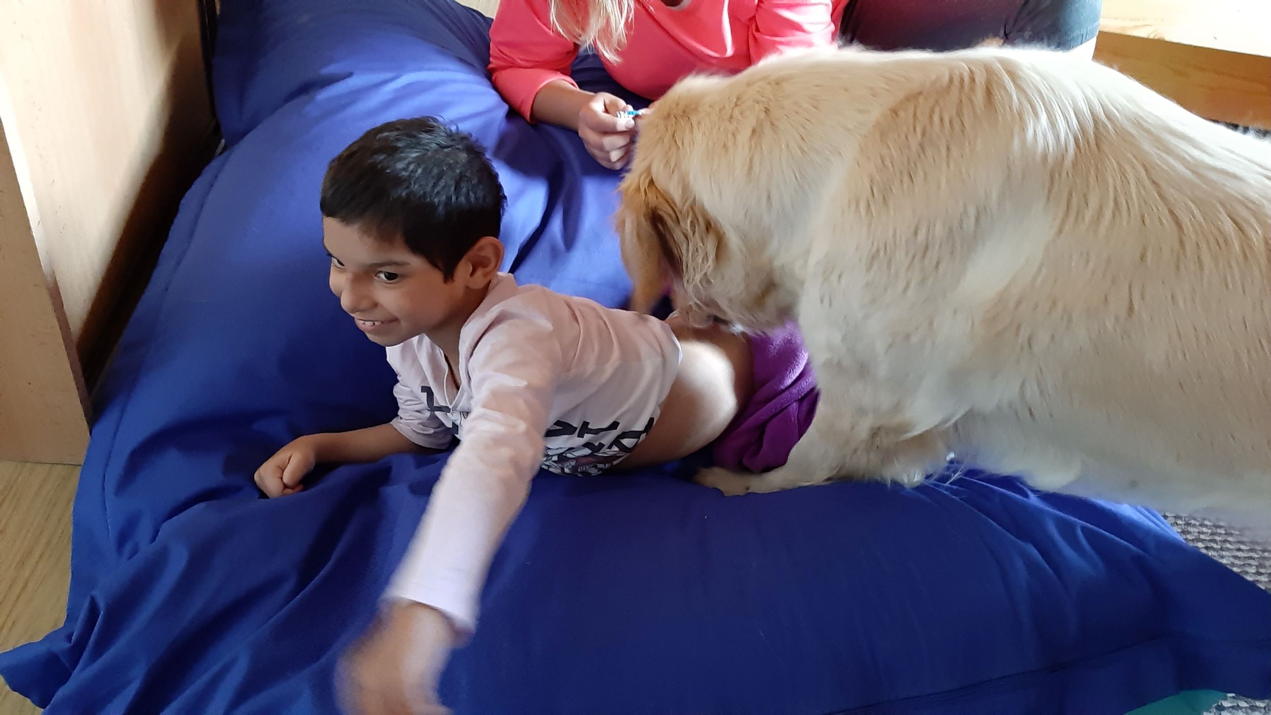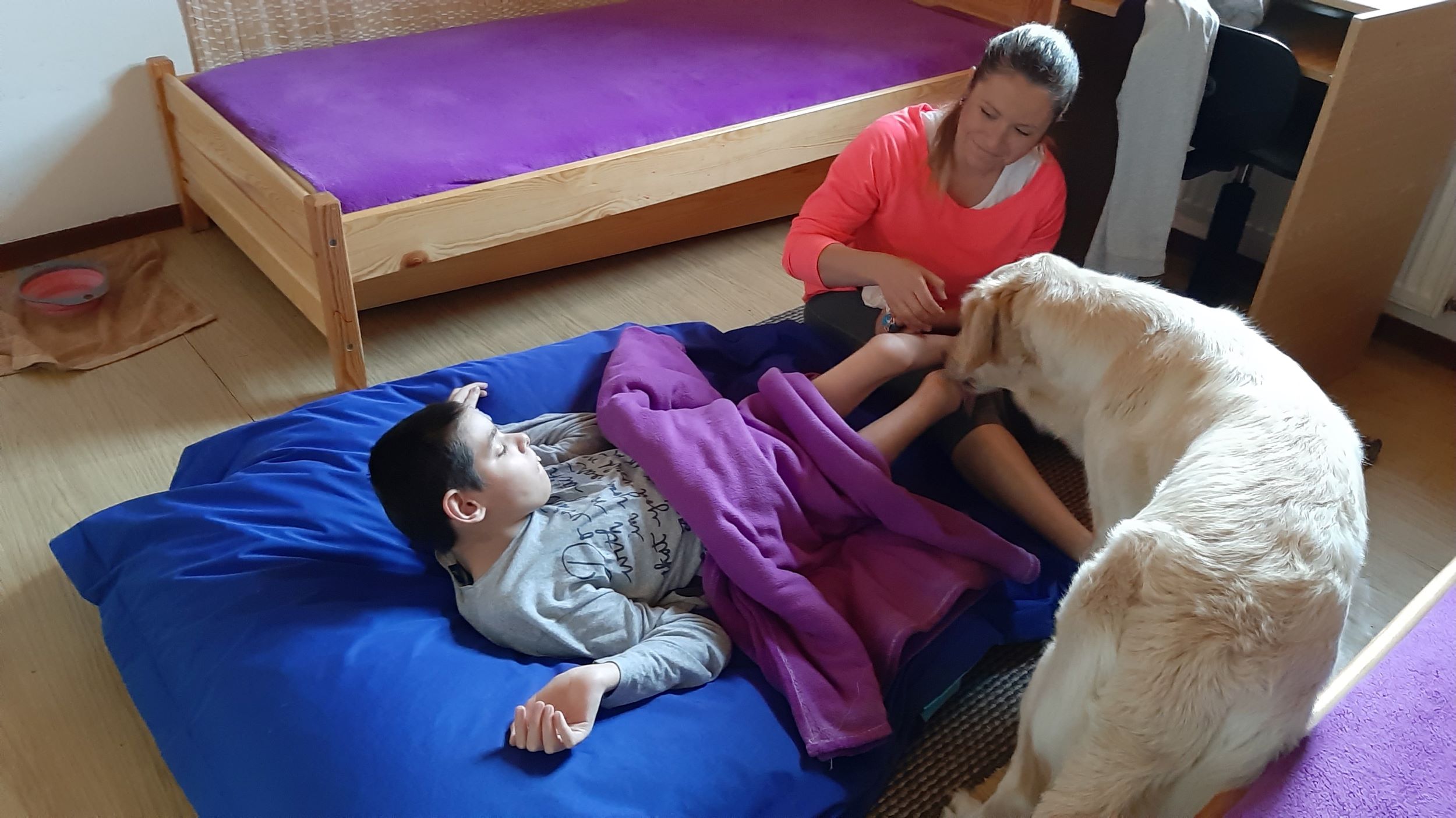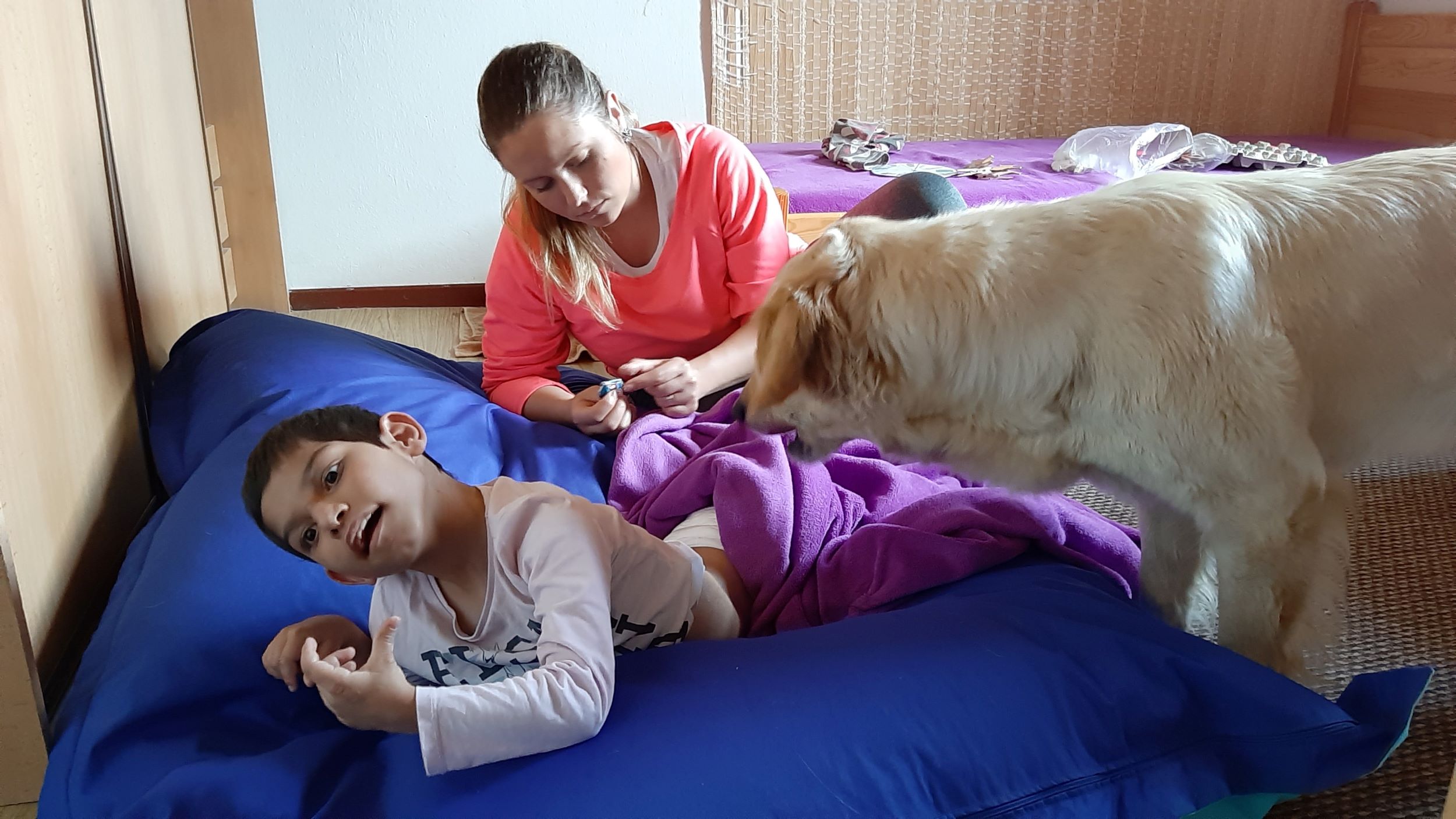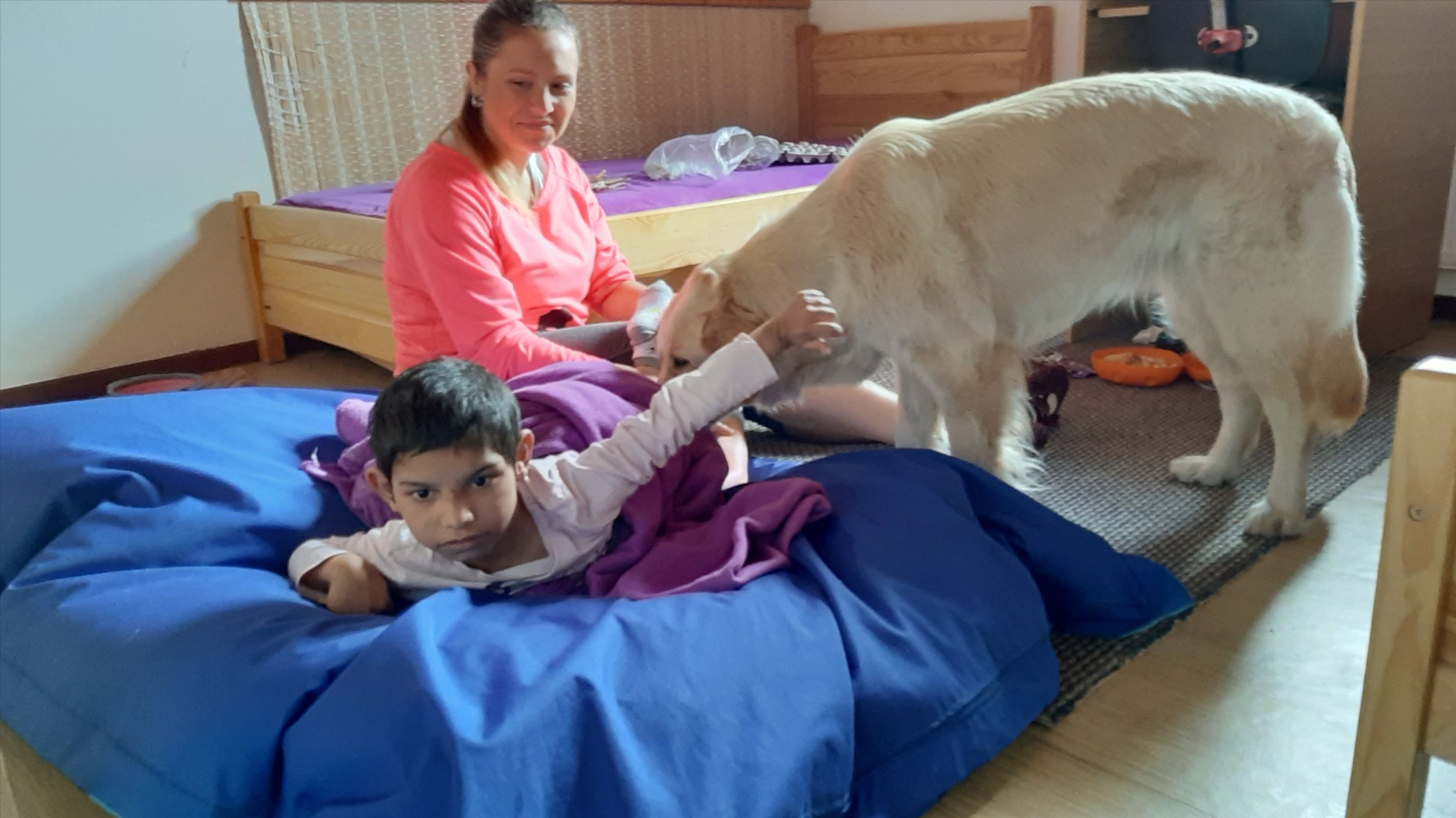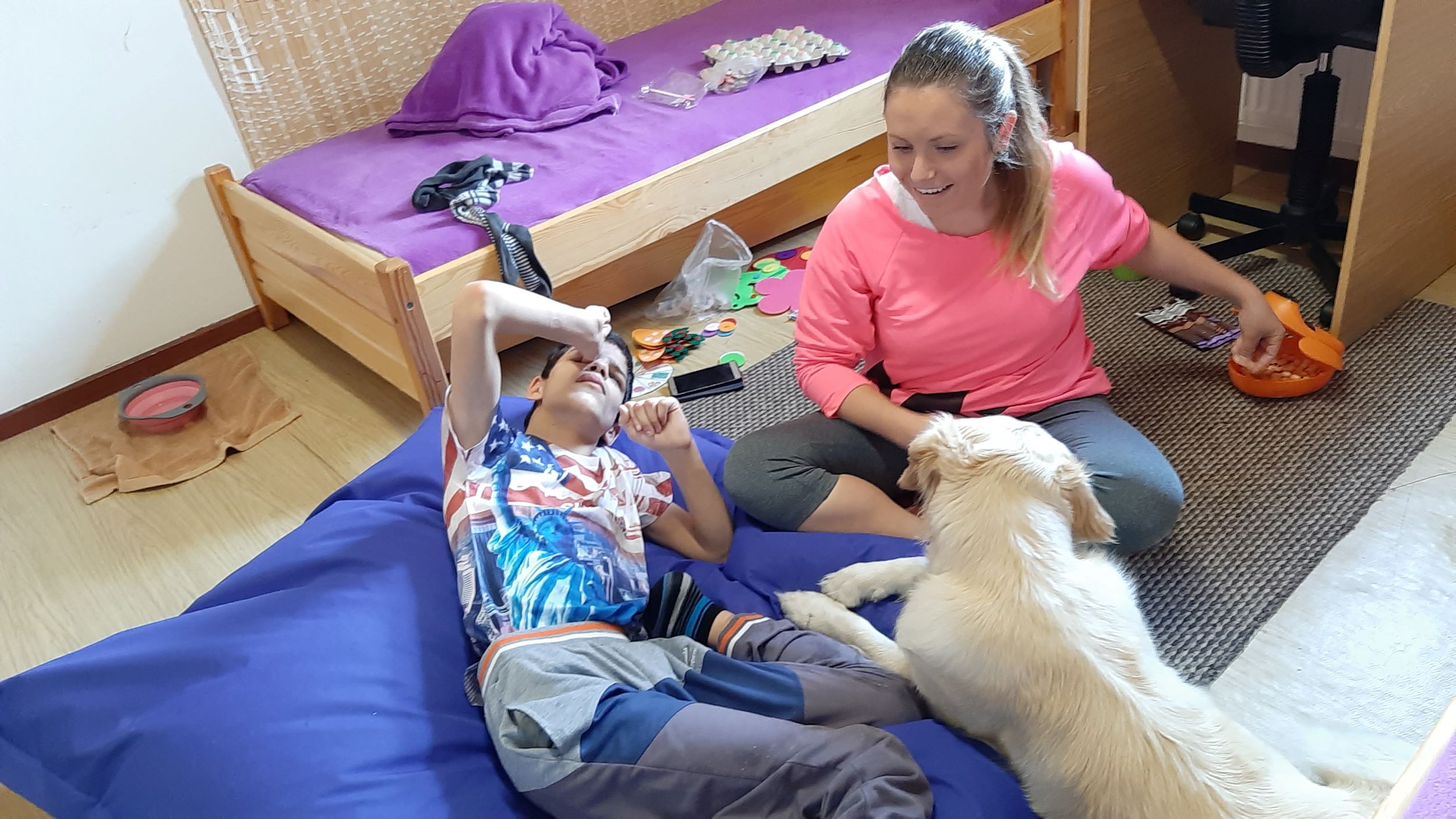Každý druhý piatok v mesiaci nás navštevuje veľmi milá návšteva. Ide o tetu Veronika so svojim psíkom Sendy. Spolu s nimi trávime jedno krásne dopoludnie plné hier a aktivít. Sendy sa stala našou veľkou priateľkou a deti sa na ňu veľmi tešia. Hra so psíkom, polohovanie, a rôzne aktivity v spoločnosti tejto štvornohej kamarátky nám veľmi prospievajú a netrpezlivo očakávame, kedy k nám opäť zavíta. Teta Veronika je veľmi priateľská a získala si pozornosť našich všetkých ratolesti. Neustále nás zahŕňa novými činnosťami, logickými a didaktickými hrami čo deti motivuje k tvorivosti. Žiaci sa veľmi tešia, keď môžu kŕmiť Sendy. Piškótky, ktoré jej tak veľmi chutia dokážu v svojich prštekoch poprelamovať na požadovaný počet kusov a s veľkým odhodlaním jej ponúkajú svoju dlaň, aby si piškótku uchmatla. Niekedy je šikovnejšia ako my, ale nám to vôbec nevadí. Táto terapia je pre nás obrovskom výzvou a my sme sa jej zhostili na 100%.